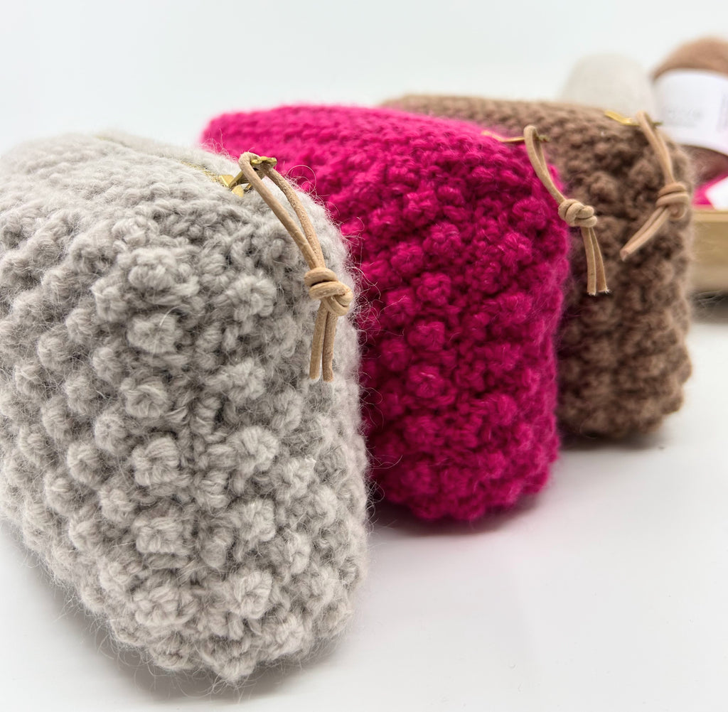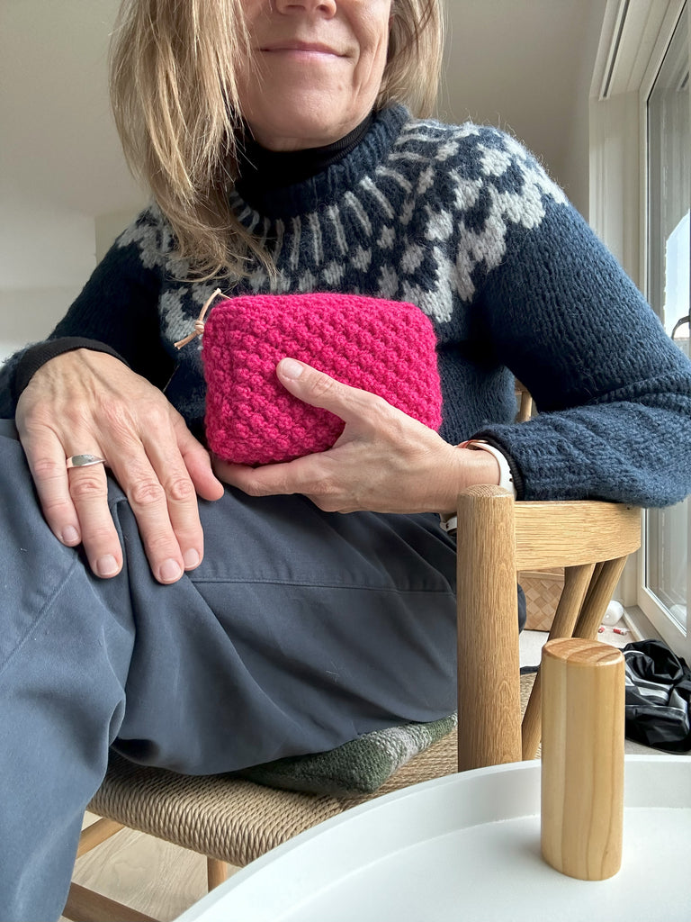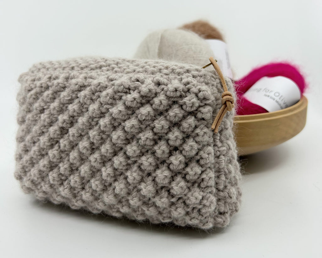 HAZEL HEAVY er lavet med Knitting for Olivie's Merino Heavy og Soft Silk Mohair og det giver den lille taske et mere fast form.